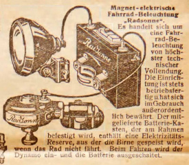 Magnet-elektrische Fahrrad-Beleuchtung Radsonne. (Anzeige aus Burgsmueller-Katalog 1926)