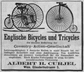 aus: Allgemeine Sport-Zeitung vom 12.1.1882, Pg.18 Englische Bicycles und Tricycles die neueste Erfindung der Coventry-Actien-Gesellschaft Leistungsfähigkeit 3 deutsche Meilen in einer Stunde bei unbedingter Sicherheit und ihne Anstrengung. Von ärztlchen Autoritäten als äußerst Vorteilhaft für die Gesundheit anempfohlen. Auch Kinder-Velocipedes in allen Größen Ausschließliche Vertretung: Albert. H. Curjel. Wien. Elisabethstrasse 5