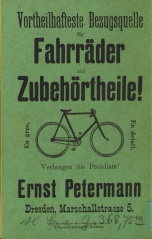 Anzeige: Ernst-Petermann (Dresden)-Großhändler, Einzelhändler. Aus: Verzeichniss der Velostat-Stationen (Dresden, ca.1900)