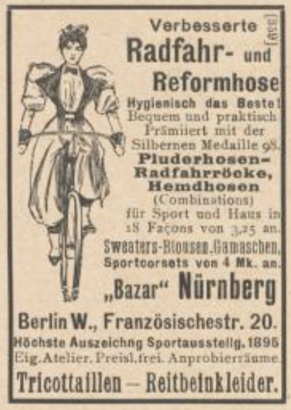Reformhose, Tricottaillen aus: Die Radlerin,1898, Heft 1, Jg.3